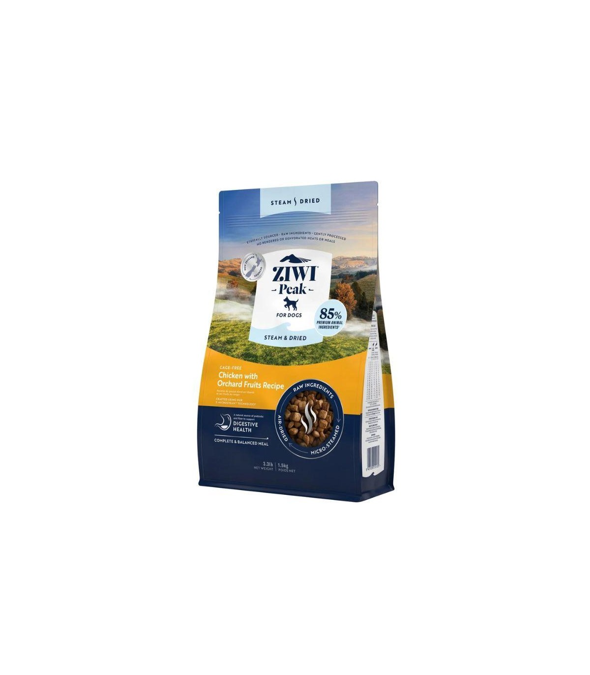 - 80% Pollo y órganos de pollo (incluyendo pollo, hígado, cuellos, hueso, cartílago, corazón), 4% Frutas (manzana, pera, kiwi, arándanos, caquis), 3% Clara de huevo seca, guisantes verdes secos, lentejas verdes secas, quinoa seca, 2% Grasa de pollo, aceite de pescado, minerales, raíz de achicoria seca, alga seca.