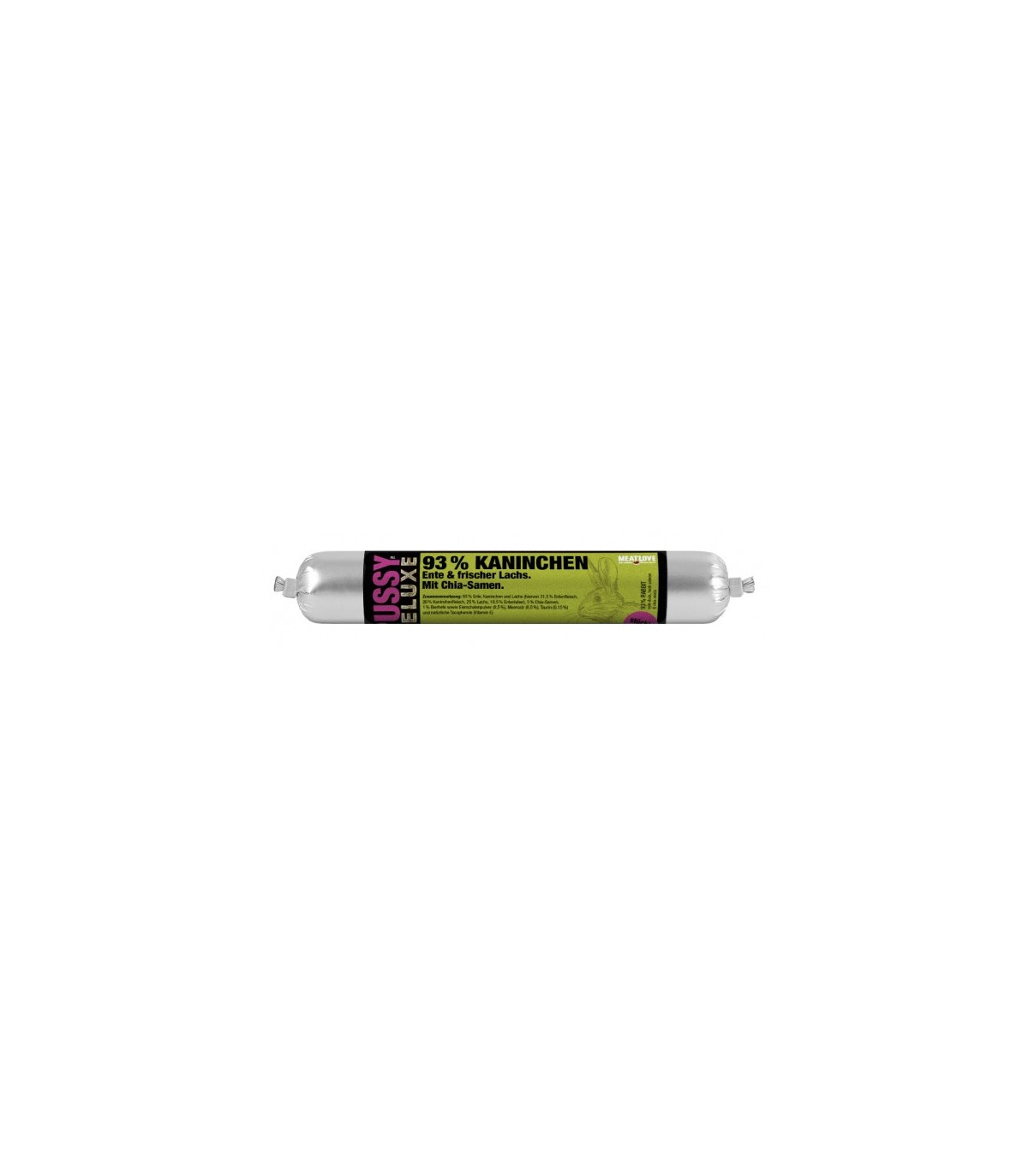 - Ingredientes: 93% pato, conejo y salmón (del cual 31,5% carne de pato, 26% carne de conejo, 25% salmón, 10,5% hígado de pato), 5% semillas de chía, 1% levadura de cerveza y cáscara de huevo en polvo (0,5%), sal marina ( 0,5%), taurina (0,15%) y tocoferoles naturales (vitamina E)