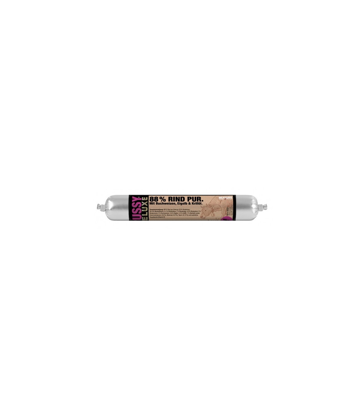 - Ingredientes: 88 % carne de vacuno pura (de los cuales 35 % corazón de vacuno, 30,4 % carne de músculo, 8,1 % hígado de vacuno, 7 % sebo de vacuno, 4,5 % sangre de vacuno, 3 % riñón de vacuno), 5 % trigo sarraceno, 2,4 % yema de huevo, 2,3 % krill aceite, 1% de levadura de cerveza y polvo de cáscara de huevo (0,6%), sal marina (0,5%), taurina (0,15%) y tocoferoles naturales (vitamina E).