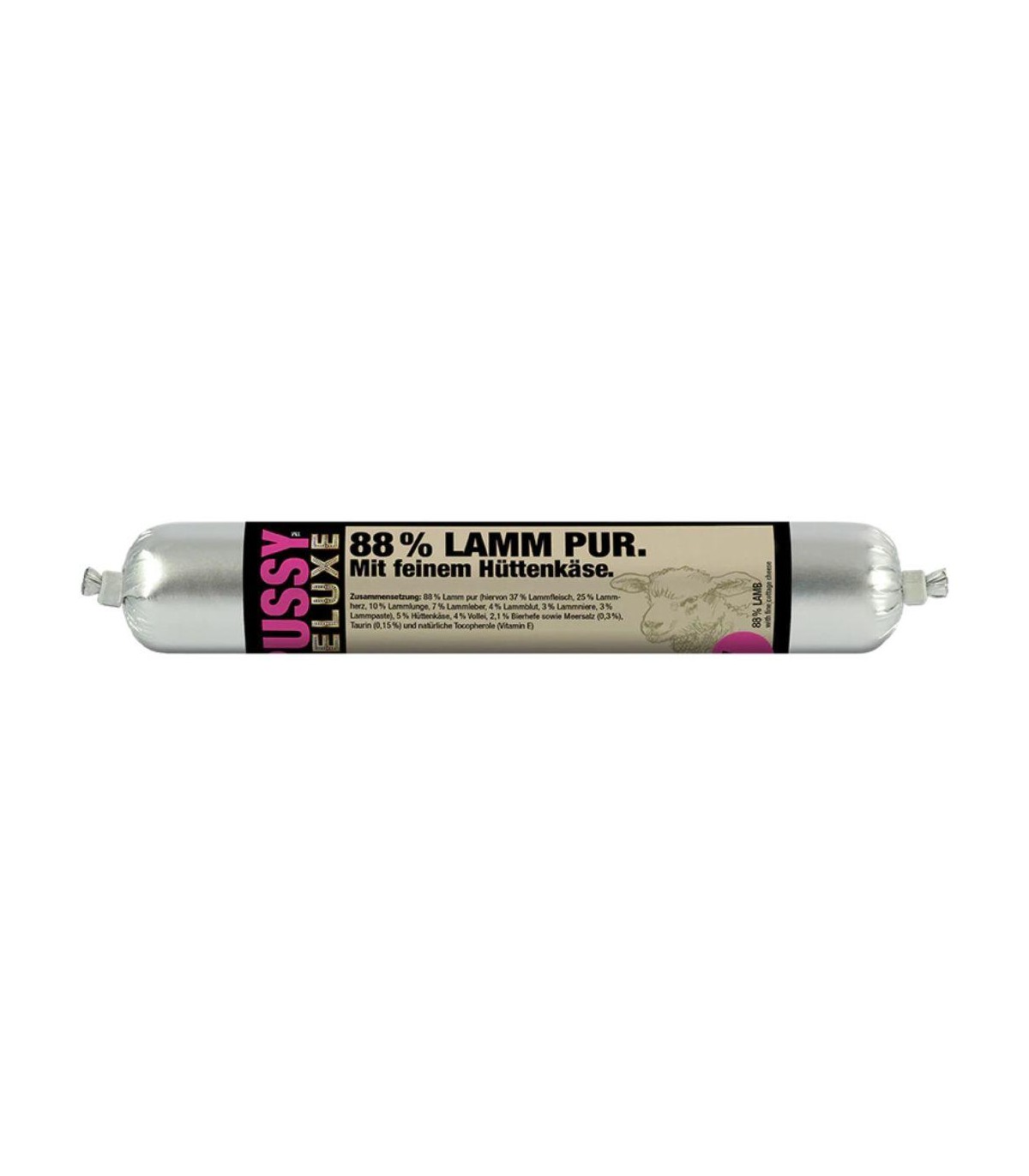 - Ingredientes: 88% cordero puro (del cual 37% carne de cordero, 25% corazón de cordero, 10% pulmón de cordero, 7% hígado de cordero, 4% sangre de cordero, 3% riñón de cordero, 3% pasta de cordero), 5% requesón, 4% huevo entero, 2,1% de levadura de cerveza y sal marina (0,3%), taurina (0,15%) y tocoferoles naturales (vitamina E).
