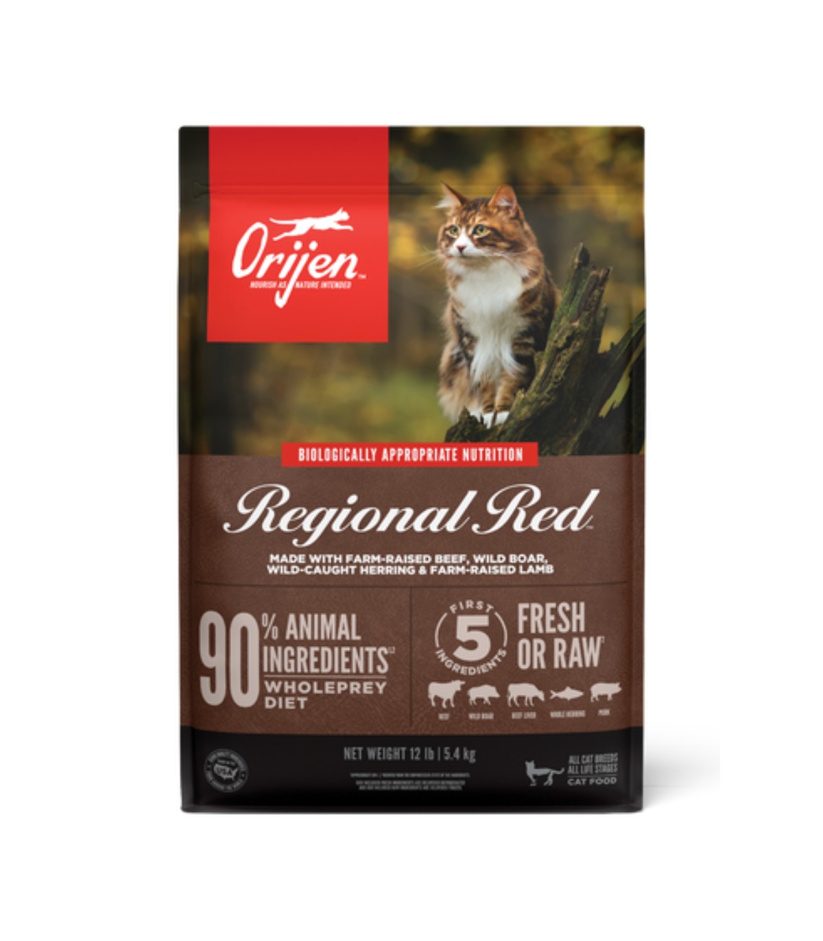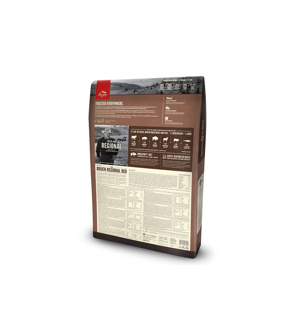 - Vacuno crudo (13%), sardina entera cruda (11%), bisonte crudo (5%), cordero crudo (5%), cerdo crudo (5%), hígado de vacuno crudo (5%), hígado de cerdo crudo (5%), huevos frescos (4%), carnero deshidratado (4%), vacuno deshidratado (4%), arenque deshidratado (4%), sardina deshidratada (4%), cordero deshidratado (4%), cerdo deshidratado (4%), aceite de canola, lentejas rojas enteras, guisantes enteros, garbanzos enteros, lentejas verdes enteras, almidón de guisantes, aceite de pescado blanco (2%), hígado de cordero crudo (2%), abadejo deshidratado (2%), judías pintas enteras, alubias blancas enteras, fibra de lenteja, riñón de vacuno crudo (0,5%), tripa de vacuno deshidratada (0,5%), riñón de cordero crudo (0,5%), tripa de cordero cruda (0,5%), algas secas, calabaza fresca entera, calabaza butternut entera fresca, calabacín entero fresco, zanahorias enteras frescas, manzanas enteras frescas, peras enteras frescas, raíz de achicoria desecada, col rizada fresca, espinacas frescas, hojas de remolacha frescas, hojas de nabo frescas, arándanos rojos enteros, arándanos azules enteros, bayas de saskatoon enteras, cúrcuma, cardo lechoso, raíz de bardana, lavanda, raíz de malvavisco, escaramujos.