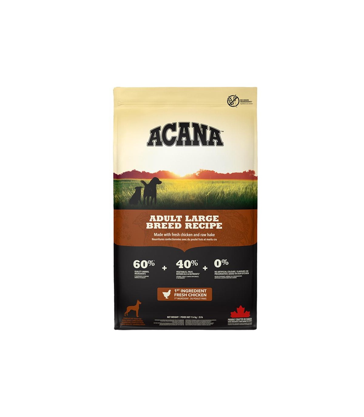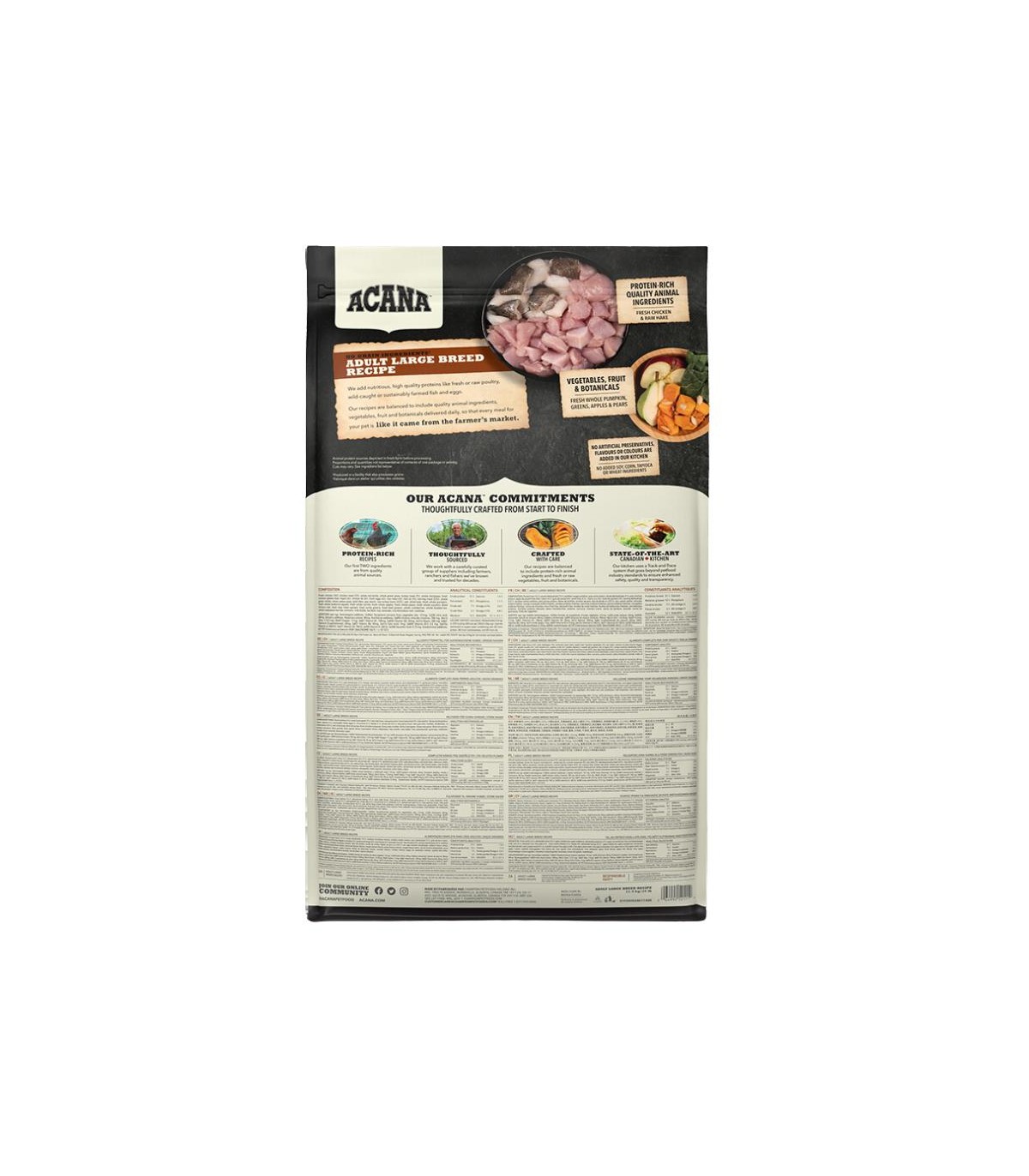 - Pollo fresco (16 %), pollo deshidratado (15 %), lentejas rojas enteras, guisantes verdes enteros, pavo deshidratado (7 %), garbanzos enteros, menudillos frescos de pollo (hígado, corazón) (4 %), grasa de pollo (4%), huevos frescos (4 %), merluza cruda (4%), aceite de pescado (3%), arenque deshidratado (2,5 %), lentejas verdes enteras, guisantes amarillos enteros, fibra de lentejas, almidón de guisantes, hígado de pavo crudo (0,5 %), sal, algas marinas secas, calabaza entera fresca, calabaza butternut entera fresca, zanahorias enteras frescas, manzanas enteras frescas, peras enteras frescas, calabacín entero fresco, raíz de achicoria seca, col rizada fresca, espinacas frescas, hojas de nabo frescas, hojas de remolacha frescas, arándanos rojos enteros, arándanos azules enteros, bayas de Saskatoon enteras, cúrcuma, cardo lechoso, raíz de bardana, lavanda, raíz de malvavisco, escaramujos.