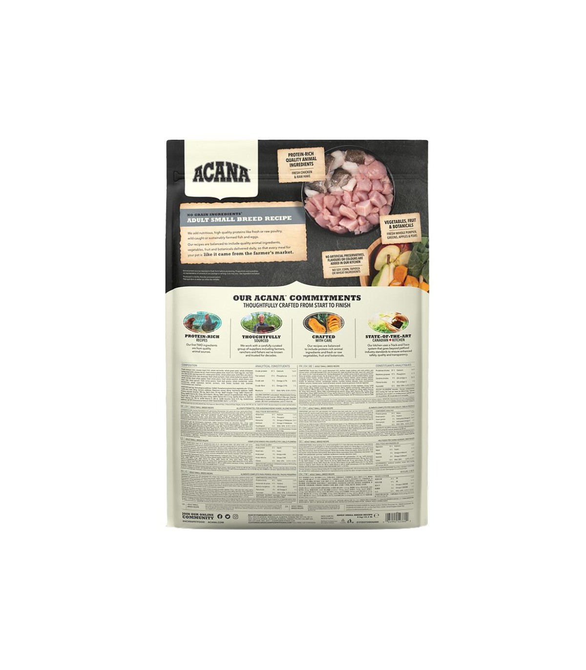 - Pollo fresco (14%), pollo deshidratado (14%), lentejas rojas enteras, guisantes verdes enteros, garbanzos enteros, pavo deshidratado (6,5%), grasa de pollo (6%), menudillos frescos de pollo (hígado, corazón) (4%), huevos frescos (4%), merluza cruda (4%), aceite de pescado (4%), arenque deshidratado (3%), lentejas verdes enteras, guisantes amarillos enteros, fibra de lentejas, almidón de guisantes, hígado de pavo crudo (0,5%), sal, algas marinas secas, calabaza entera fresca, calabaza butternut entera fresca, zanahorias enteras frescas, manzanas enteras frescas, peras enteras frescas, calabacín entero fresco, raíz de achicoria seca, col rizada fresca, espinacas frescas, hojas de nabo frescas, hojas de remolacha frescas, arándanos rojos enteros, arándanos azules enteros, bayas de Saskatoon enteras, cúrcuma, cardo lechoso, raíz de bardana, lavanda, raíz de malvavisco, escaramujo