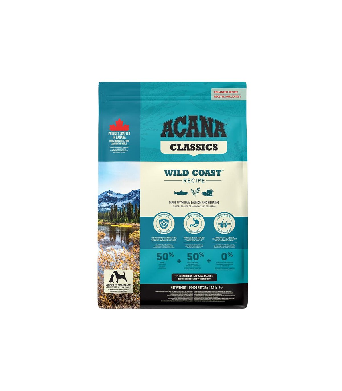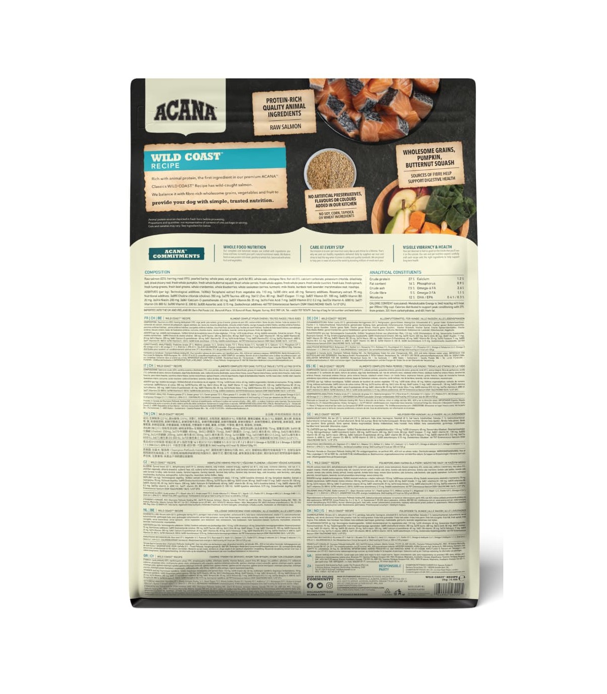 - Salmón crudo (22 %), arenque deshidratado (19 %), cebada perlada, guisantes enteros, granos de avena, grasa de cerdo (8 %), avena integral, fibra de garbanzos, aceite de pescado (1 %), carbonato de calcio, cloruro de potasio, alga kelp deshidratada, sal, raíz de achicoria seca, calabaza entera fresca, calabaza butternut entera fresca, zanahorias enteras frescas, manzanas enteras frescas, peras enteras frescas, calabacín entero fresco, col rizada fresca, espinacas frescas, grelos frescos, hojas de remolacha frescas, arándanos rojos enteros, arándanos azules enteros, bayas de Saskatoon enteras, cúrcuma, cardo lechoso, raíz de bardana, lavanda, raíz de malvavisco, escaramujos.