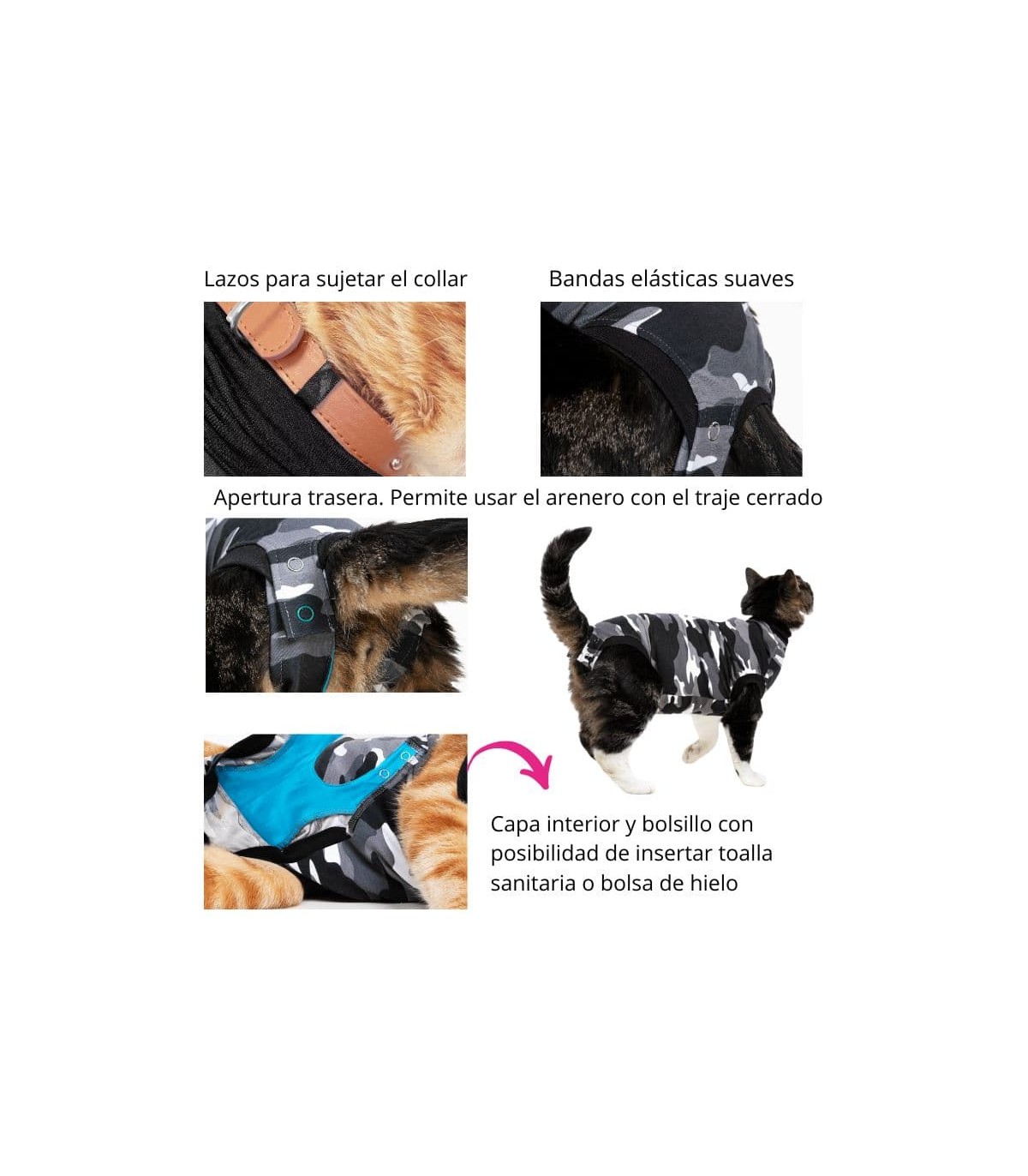 - Gracias a la abertura especialmente diseñada en la parte posterior, para la mayoría de los gatos, puedes dejar el Recovery Suit completamente cerrado mientras el gato usa la caja de arena. Aunque se aconseja comprar dos trajes de recuperación, por si uno de los dos se mancha poder tener otro de sustitución.