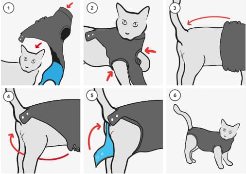 - Sabemos lo importante que es poder vestir y desvestir rápidamente a tu gato, por eso nuestro Recovery Suit está fabricado con un material suave y elástico de alta calidad. El Recovery Suit tiene un ajuste ceñido para evitar que su gato se mueva. Sin embargo, es importante seguir vigilando a tu gato si el ajuste ceñido no es demasiado ajustado. Poner y quitar el Recovery Suit a tu gato es sencillo, ¡así que echemos un vistazo!