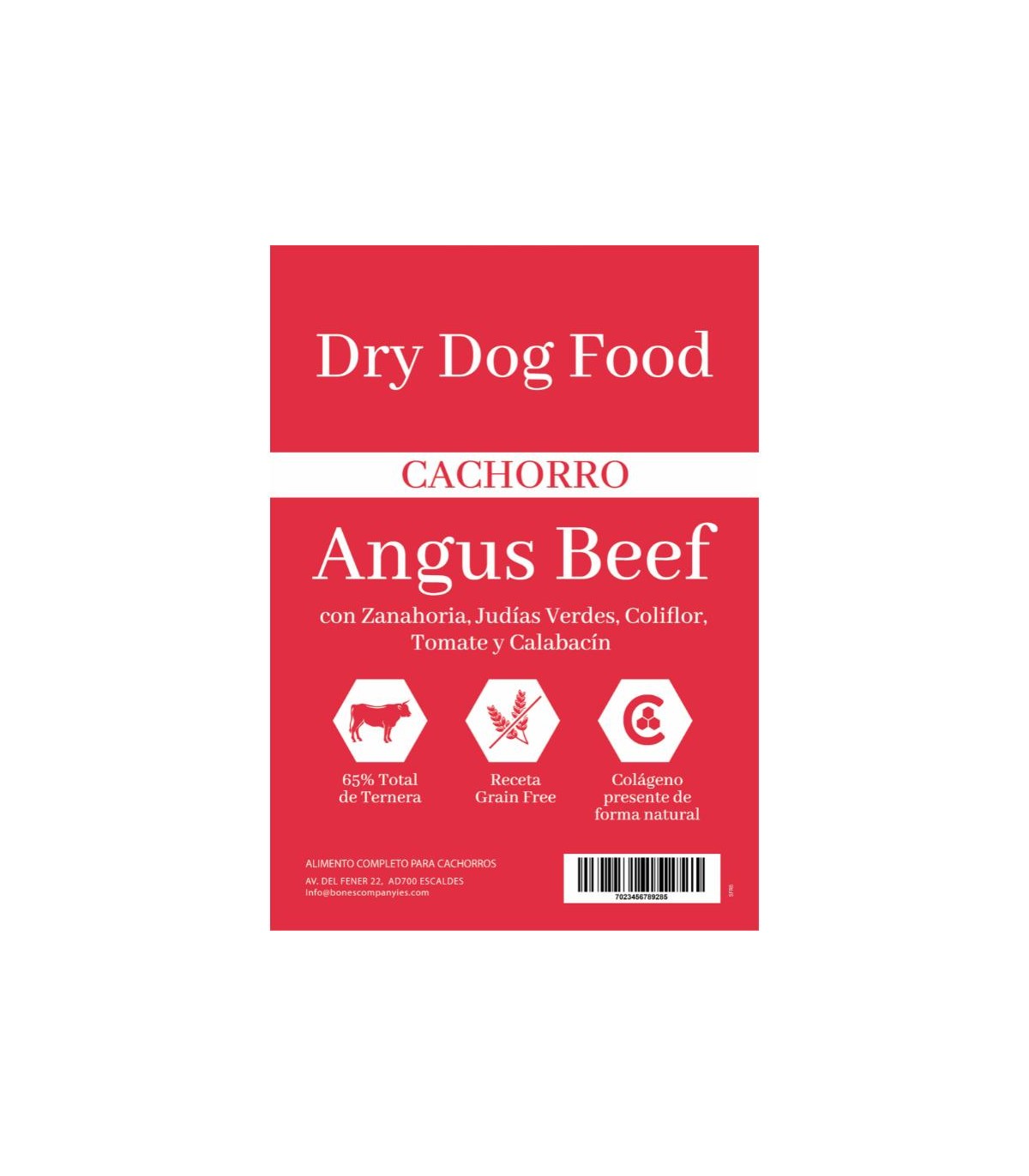 - Ingredientes: Ternera 65% (incluyendo Ternera Angus Preparada Fresca 35%, Ternera Deshidratada 25%, Grasa de Ternera 5%), Boniato, Judias, Pulpa de Remolacha,