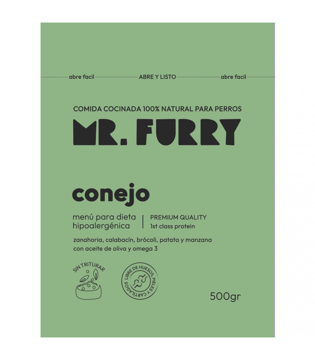 - Ingredientes: Conejo 63% (carne magra de conejo 27%, corazón de cordero 26% e hígado de cordero 10%), Verduras 27,8% (zanahoria 12%, calabacín 3,9%, brócoli 4%, patata 7,9)