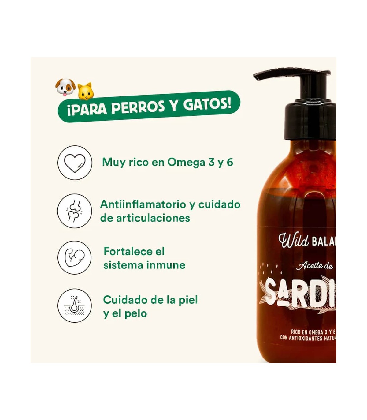 • Aceite crudo y natural de sardina 100%: 26% Omega 3 (EPA 18% y 9% DHA) y 8% Omega 6.